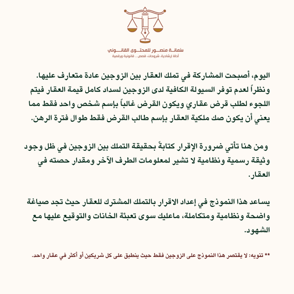 ومن هنا تأتي ضرورة الإقرار كتابةً بحقيقة التملك بين الزوجين في ظل وجود وثيقة رسمية ونظامية لا تشير لمعلومات الطرف الآخر ومقدار حصته في العقار.